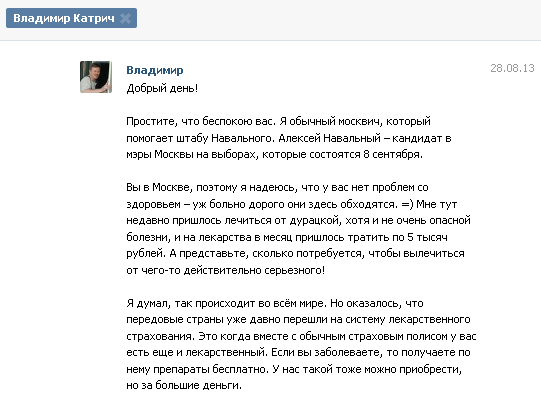 Сторонники кандидата в мэры Москвы выдвиженца либеральной партии РПР-ПАРНАС Алексея Навального приступили к массовому спаму в социальных сетях. Редакцией ФОРУМа.мск зафиксирован образец подобного "творчества" в сети "ВКонтакте". От имени пользователя "Владимир Катрич" осуществляется индивидуальная адресная рассылка через личные сообщения.