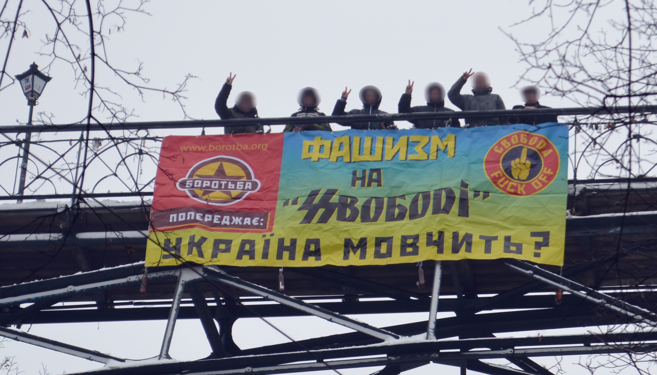 Активисты Объединения «БОРОТЬБА» вывесили на пешеходном Парковом мосту баннер: «Осторожно! Фашизм на «SSвободе». Украина молчит». Таким образом организаторы акции пытаются привлечь внимание к активизации ультраправых, неонацистских сил в ходе массовых акций Евромайдана.