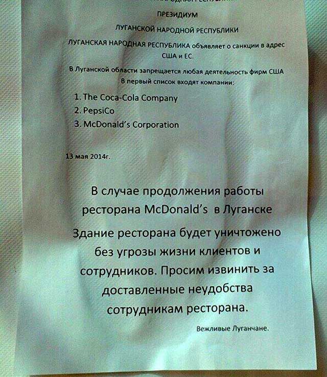«Луганская народная республика объявляет о санкции в адрес США и ЕС. В Луганской области запрещается любая деятельность фирм США. В первый список входят компании: The Coca–Cola Company, PepsiCo, McDonald's Corporation», – говорится в опубликованном заявлении.