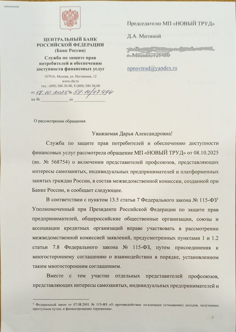 Уже понятно, что никакого осмысленного решения в такой схеме ждать не приходится - на финал документ попадает в руки именно тому чиновнику, которому оно как собаке пятая нога - где профсоюз самозанятых и где Центробанк...