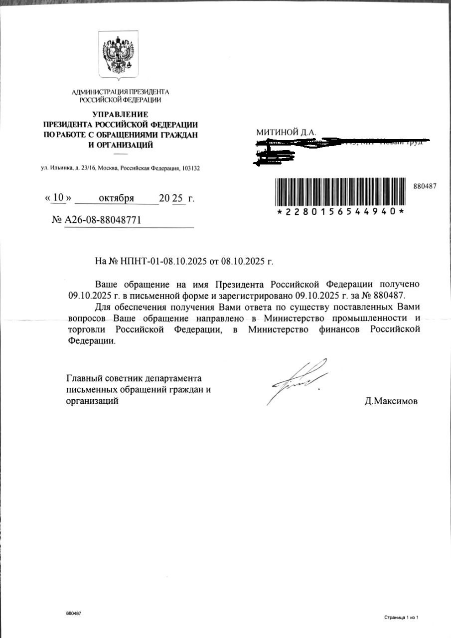Это отдельный вопрос, как обращение к Президенту РФ попало сначала в министерство, а потом в Центробанк, в службу по защите прав потребителей - ну хорошо хоть не в леспромхоз Семиструйского района.