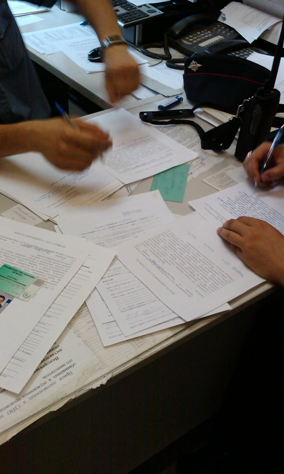 От редакции: Милиция продолжает нарушать права граждан. Так, правозащитники прислали в редакцию ФОРУМа.мск фотографии с задержаний 31 июля, когда сотрудники Басманного ОВД, милиционеры 2 ОПМ оформляют свои рапорта в отношении задержанных.