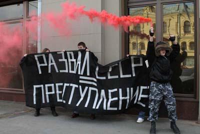 Участники акции, не дожидаясь появления сотрудников милиции и ФСО, покинули место ее проведения. Никто из активистов задержан не был, сообщает пресс-служба Левого Фронта.