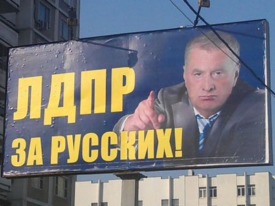 «ЛДПР - за русских», - заявляет Жириновский, глядя на москвичей с билбордов и сердито сдвинув брови.