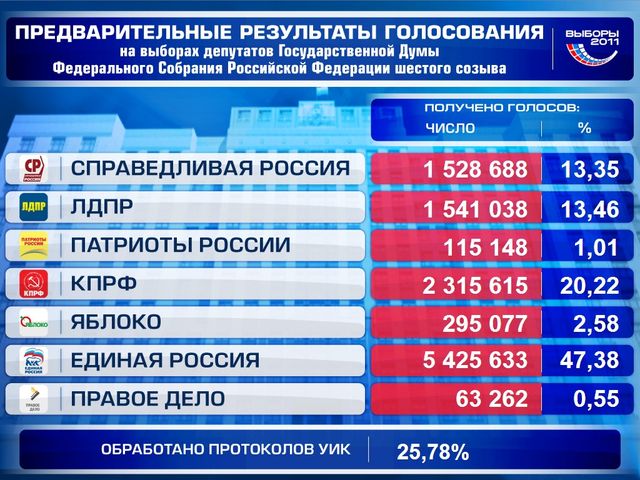 По данным ЦИК, после подсчета 25,78% бюллетеней результат "Е...ной России" немного улучшился - до 47,38 процентов.