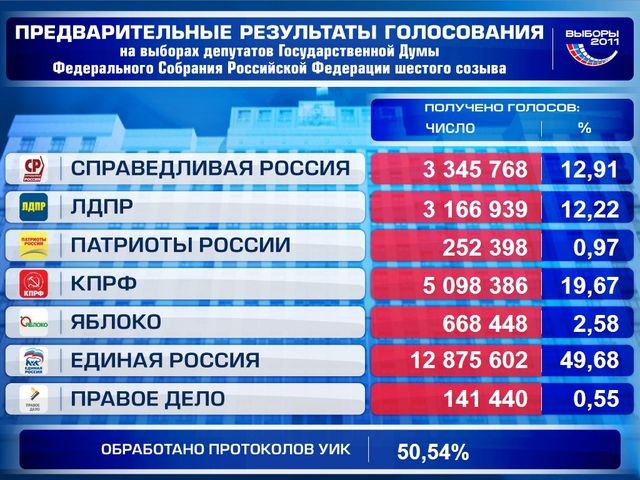 В точности с прогнозом ФОРУМа.мск к моменту подсчета 50% голосов результат "Е...ной России" вплотную приблизился к цифре "50%", но не пересек заветную черту.