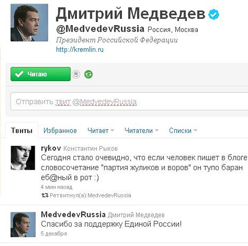 Президент России Дмитрий Медведев перепостил в своем Twitter'е матерную запись прокремлевского пиарщика, единоросса Константина Рыкова: "Сегодня стало очевидно, что если человек пишет в блоге словосочетание "партия жуликов и воров" он тупо баран е**ный в рот :)".