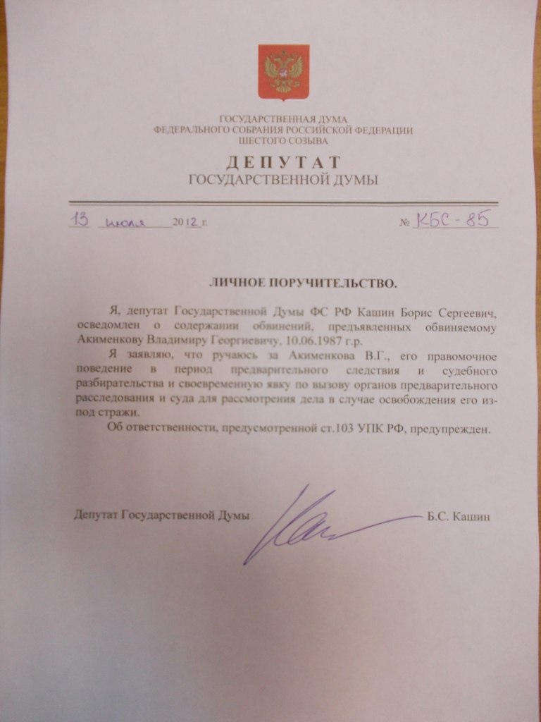 Личное поручительство за арестованного по обвинению в участии в беспорядках 6 мая Владимира Акименкова дал депутат Государственной Думы от КПРФ Борис Кашин. Это еще один депутат, поручившийся за его правомочное поведение в период предварительного следствия.